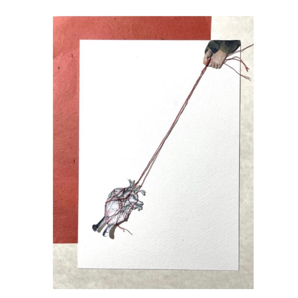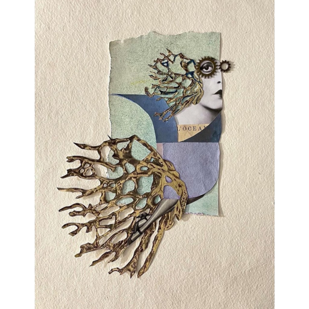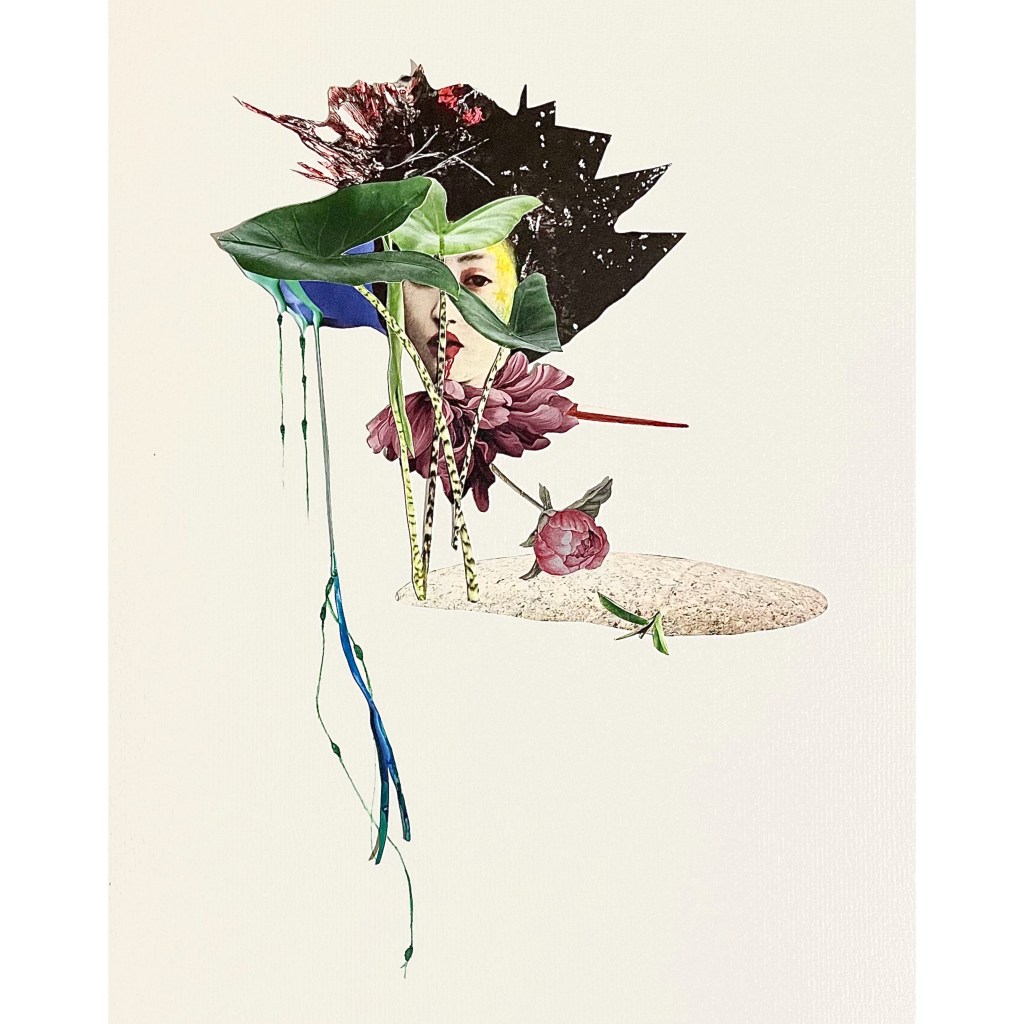 Collage analogico, carta, acrilico, china, montato su carta fatta a mano